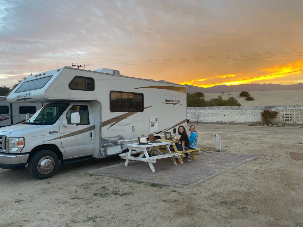 The next morning we left just before dawn (I’m the early riser driver of the family) and drove a couple of hours to Mexicali to cross the border. That was a bit of a nightmare circling around all over town following detour signs, but eventually we found the right place and waited about an hour in traffic. The border itself was easy- we had a lovely customs agent who asked us a few questions, did a cursory check around the rig and sent us on our way.